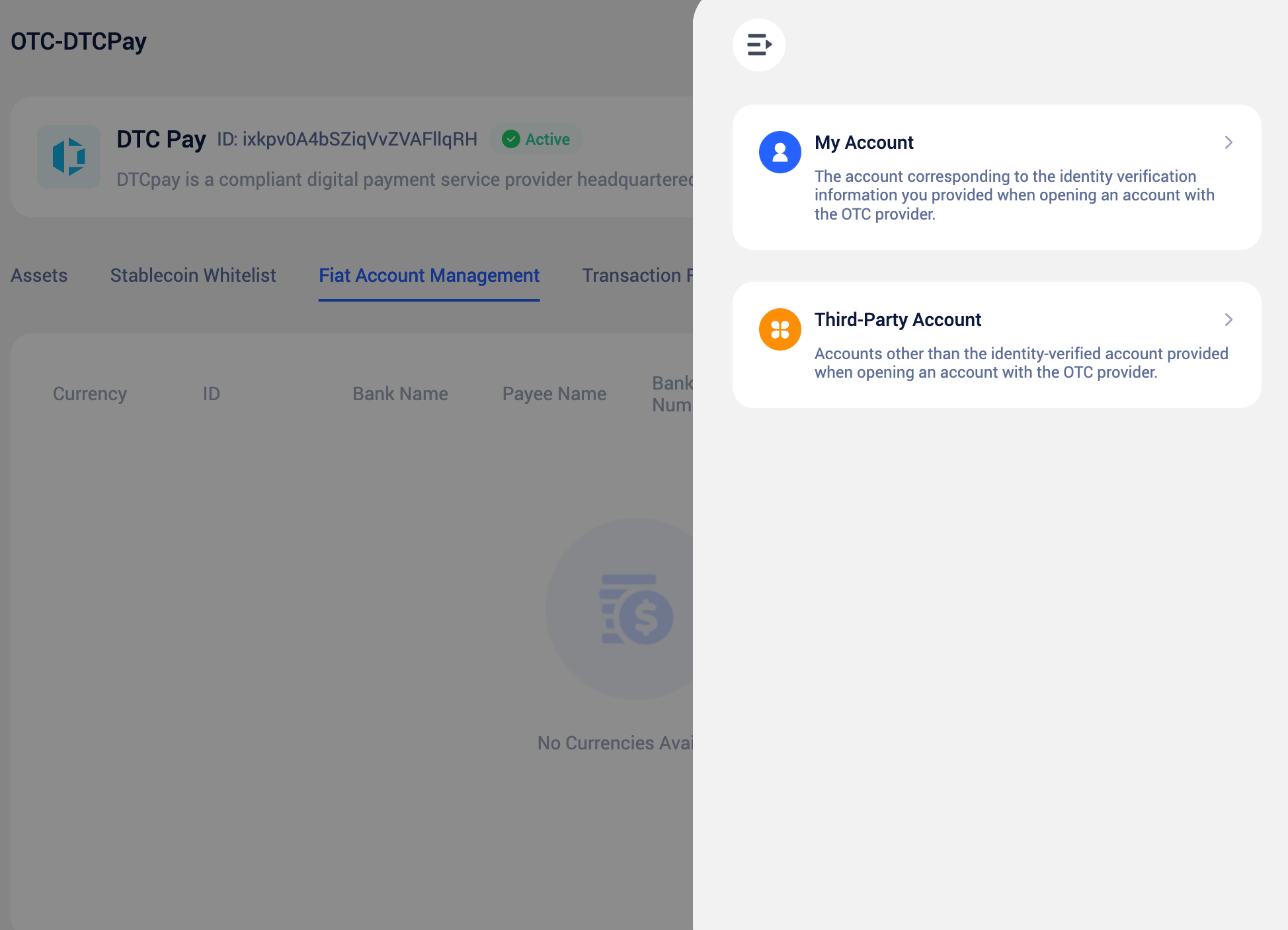 Registration: If you choose DtcPay — a licensed and compliant OTC service provider — you must first create an account on the DtcPay platform. You can contact our platform’s customer service for registration guidance and assistance to simplify integration and shorten onboarding time, or you can contact DtcPay directly to complete the registration process on your own. If you already have a DtcPay account, you can proceed directly to add and configure the account within this system.