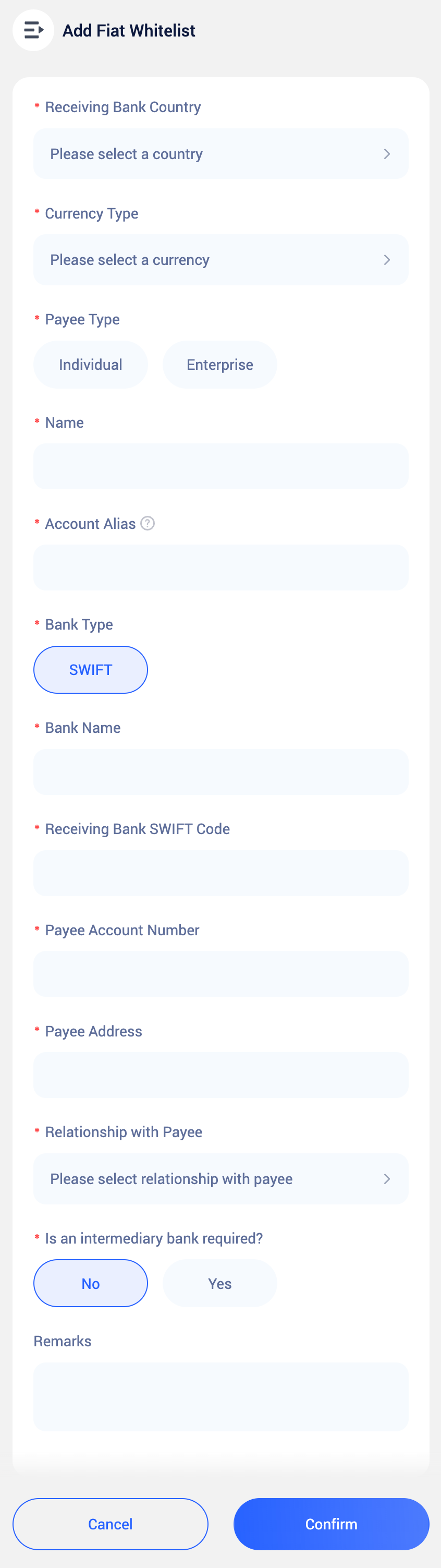 Fiat accounts are receiving accounts used for fiat withdrawals. You can choose your own account or a third-party account for withdrawal operations. Adding complete account information in advance helps improve efficiency and reduce errors.