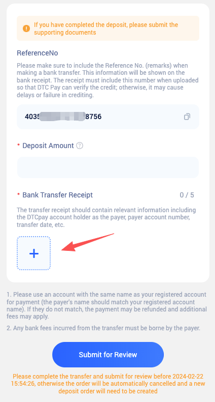 After review approval, the funds will be credited to your balance. If funds are not credited for an extended period, please contact DtcPay customer support.