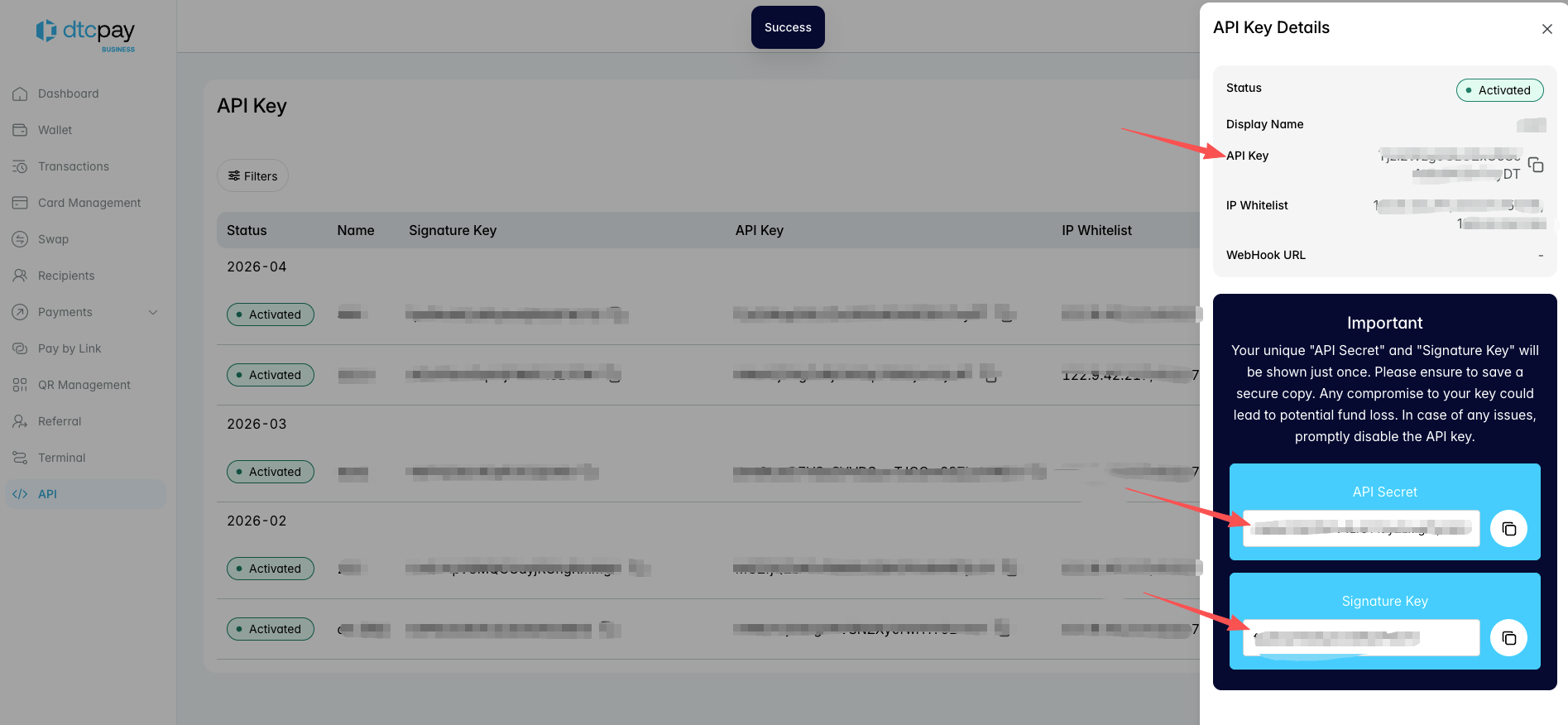 - IP Whitelist Address: Used to authorize this system’s server access in the DtcPay dashboard
