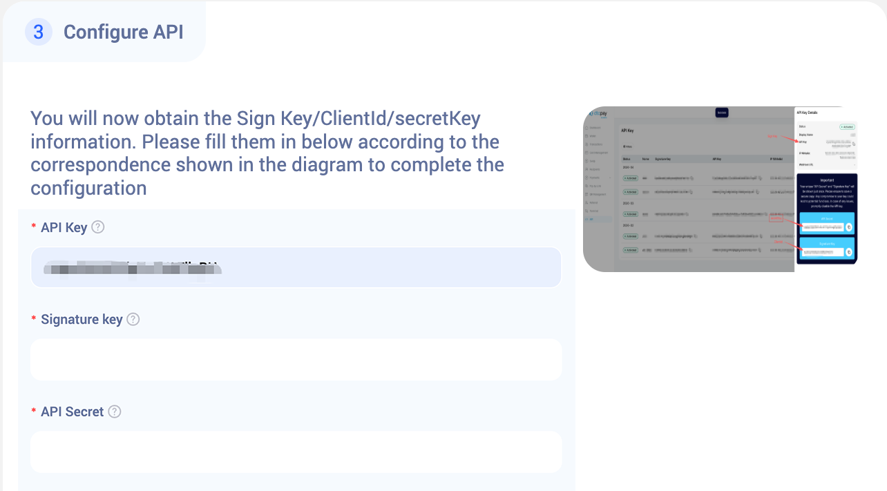 Return to this system and enter the generated ClientId, SecretKey, and Sign Key into the corresponding fields, then click “Create” to complete the configuration.