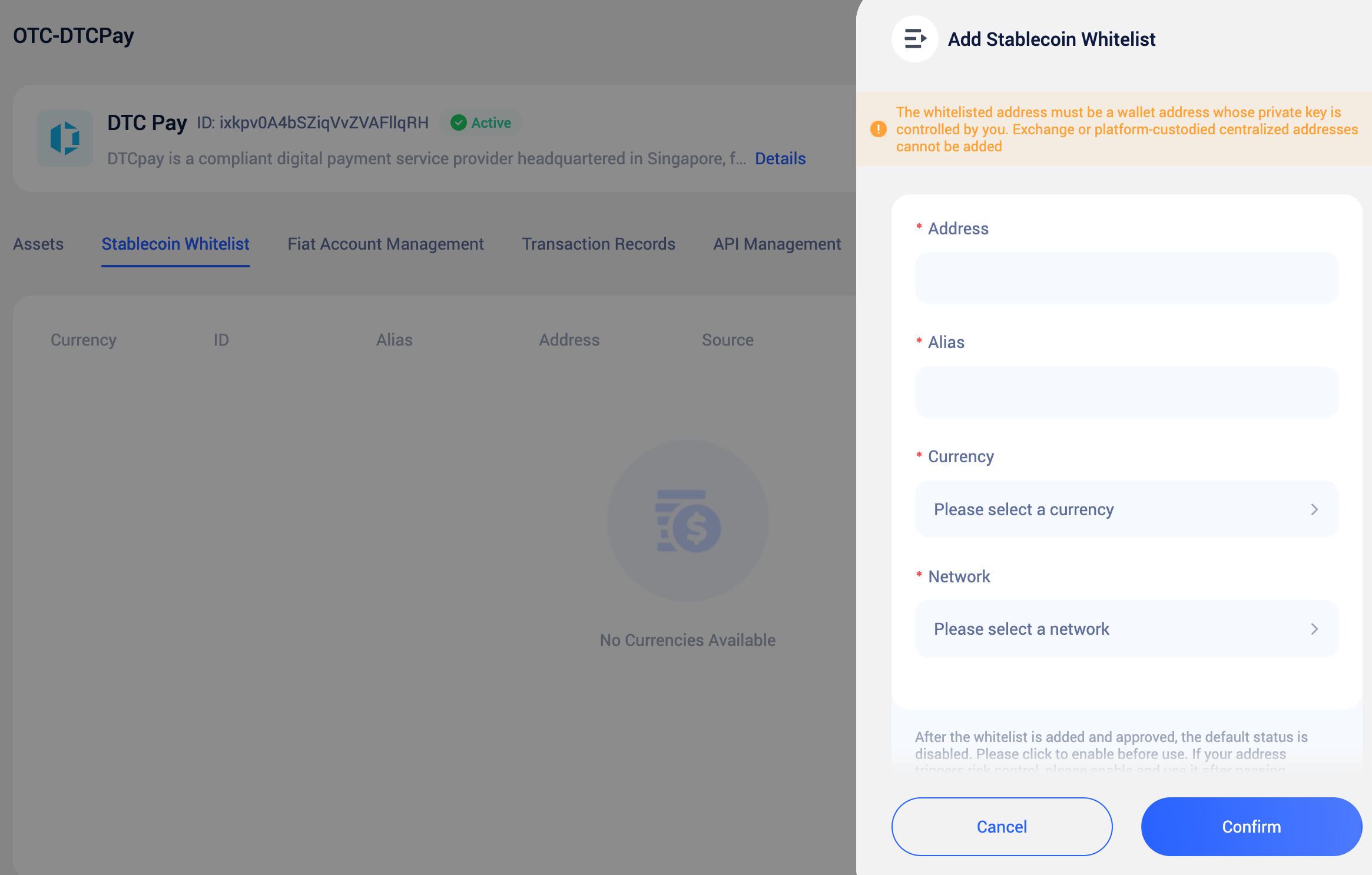 Whitelisted addresses must be wallet addresses for which you hold the private keys — exchange or platform-custodied addresses are not permitted. Additionally, when depositing stablecoins to DtcPay, transfers must originate from a whitelisted address; otherwise, the funds may not be credited.